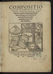 Edition originale de l'important traité de Sebastian Münster sur les cadrans solaires, le « premier recensement exhaustif des types de cadrans solaires ». Important ouvrage fondateur, le « Compositio horologiorum » deviendra une référence incontournable pour tous les auteurs traitant de gnomonique aux XVIe et XVIIe siècles.L'illustration, d'une grande richesse, se compose, en plus de la vignette du titre, de 55 figures gravées sur bois, certaines à pleine page. Hollstein attribue 5 de ces gravures à Hans Holbein le Jeune.Le présent traité est un précieux jalon de l'histoire des livres de sciences, reconnu comme une des plus importantes productions de l'esprit scientifique et technique.